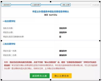 4.“返回修改志愿”或“确认志愿信息”。考生提交志愿信息后,进入志愿信息确认页;在未确认前,可多次返回修改;若志愿修改后未进行确认则上次确认的志愿依然有效;确认志愿信息截图(示例)如下:
