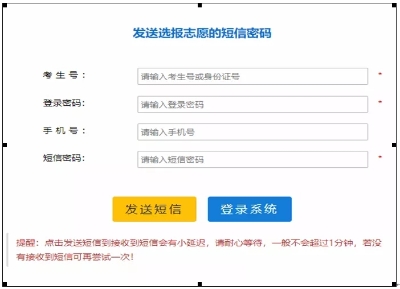 4.考生已输入手机号码但没接收到短信密码的,请于5月31日上午报给所在班班主任(注明姓名、学籍号、手机号码),学校汇总后报区县教体局基教科,区县汇总于5月31日下午报市教育局基教科。考生也可在选报志愿时输入手机号码,即时获取短信密码,但系统会有延时,建议提前操作。