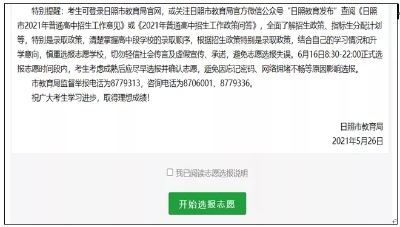 特别提醒:考生可登录日照市教育局官网,或关注日照市教育局官方微信公众号“日照教育发布”查阅《日照市2021年普通高中招生工作意见》或《2021年普通高中招生工作政策问答》,全面了解招生政策、指标生分配计划等,特别是录取政策,清楚掌握高中段学校的录取顺序,根据招生政策特别是录取政策,结合自己的学习情况和升学意向,慎重选报志愿学校,切勿轻信社会传言及虚假宣传、承诺,避免志愿选报失误。6月16日8:30-22:00正式选报志愿时间段内,考生考虑成熟后应尽早选报并确认志愿,避免因忘记密码、网络拥堵不畅等原因影响选报。