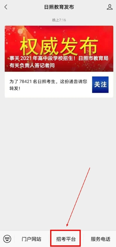 一、选报志愿平台。考生通过日照市教育局官方网站(网址http://jyj.rizhao.gov.cn/)或市教育局微信公众号“日照教育发布”登录“日照市高中段学校考试招生录取工作服务平台”进行志愿选报。考生可以选择电脑或手机进行志愿选报。如考生不具备在家庭选报志愿条件,在正式选报志愿当天,考生可到初中学校选报志愿,由初中学校提供场地、设备、上网条件及其他必要的帮助。
